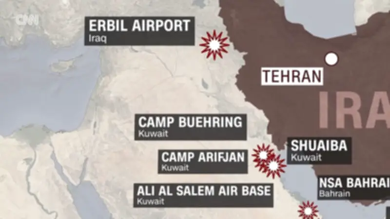 কুয়েতের ক্যাম্প বুয়েহরিংয়ে মার্কিন অবস্থানে ইরানের তৈরি বলে ধারণা করা ‘আরশ ২’ ড্রোন হামলা চালায়, যার ফলে একটি ভবন মারাত্মকভাবে ক্ষতিগ্রস্ত হয়। ঘাঁটির ভেতরে পার্ক করা মার্কিন হেলিকপ্টারগুলো অল্পের জন্য রক্ষা পায়, যা হামলার তীব্রতা নির্দেশ করে।
