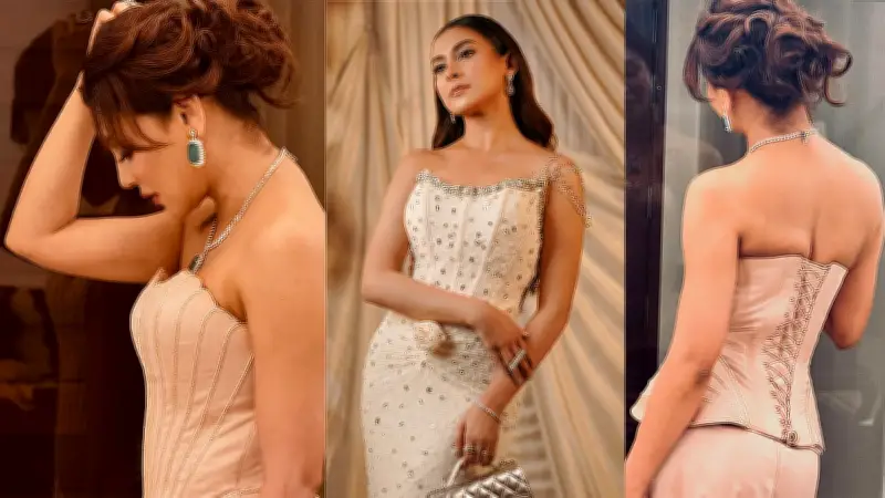 তার বডিকন ড্রেসের নিখুঁত ফিটিং এবং মাঝে গ্যাদার্ড ফেব্রিকের সঙ্গে রোজ এমবেলিশমেন্ট নজর কাড়তে সক্ষম হয়েছে। মেকওভারের দিক থেকে তিনি একটি সফট গ্ল্যাম লুক বেছে নিয়েছিলেন, যেখানে ন্যুড লিপস এবং সফট ওয়েভস হেয়ারস্টাইল পুরো আউটফিটের সঙ্গে মানানসই হয়েছে।