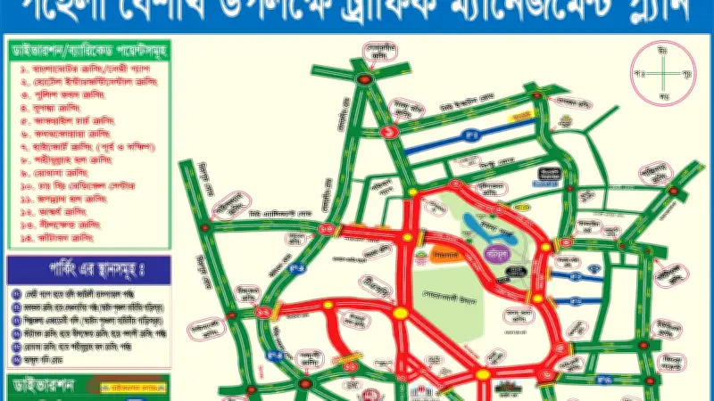 বাংলা নববর্ষের উৎসবমুখর পরিবেশে রাজধানী ঢাকায় যানবাহন চলাচলে বিশেষ নির্দেশনা দিয়েছে ঢাকা মহানগর পুলিশের ট্রাফিক বিভাগ। পয়লা বৈশাখ উপলক্ষে শহরের বিভিন্ন সড়কের ১৪টি গুরুত্বপূর্ণ পয়েন্টে ডাইভারশন দেওয়া হবে বলে ঘোষণা করা হয়েছে। এদিন যানজট এড়াতে বিকল্প সড়ক ব্যবহারের জন্য নাগরিকদের প্রতি আহ্বান জানানো হয়েছে।