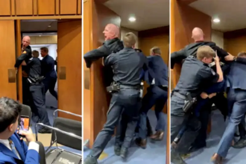 শুনানি চলাকালে ব্রায়ান ম্যাকগিনিস জোরালো কণ্ঠে চিৎকার করে বলতে থাকেন, ‘এই যুদ্ধের মূল কারণ হলো ইসরায়েল। ইসরায়েলের হয়ে যুক্তরাষ্ট্র যুদ্ধ করতে চায় না।’ তাঁর এই আকস্মিক ও উত্তেজিত প্রতিবাদে পুরো শুনানির পরিবেশ বিঘ্নিত হয়। একপর্যায়ে তাঁকে কক্ষ থেকে সরিয়ে নেওয়ার চেষ্টা করা হলে ক্যাপিটল পুলিশ ও সিনেটর শিহির সঙ্গে ধস্তাধস্তি শুরু হয়। রয়টার্স কর্তৃক যাচাইকৃত একটি ভিডিওতে দেখা যায়, সামরিক পোশাক পরিহিত ব্রায়ানকে দরজা দিয়ে টেনে বের করার সময় তাঁর হাত খোলা দরজার কবজায় আটকে যায় এবং হাড় ভাঙার শব্দ শোনা যায়। প্রত্যক্ষদর্শীরা উল্লেখ করেছেন যে ধস্তাধস্তির সময় ম্যাকগিনিস বারবার বলছিলেন, ‘ইসরায়েলের হয়ে কেউ লড়তে চান না।’