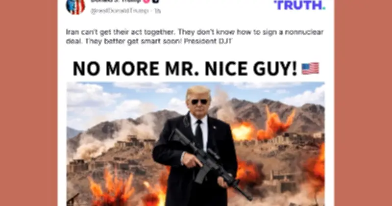 ট্রাম্প লিখেছেন, ইরান পরমাণু অস্ত্রমুক্ত চুক্তির পথে হাঁটতে ব্যর্থ হচ্ছে। তেহরানকে সতর্ক করে তিনি লেখেন, ইরানকে ‘দ্রুত বুদ্ধিমান (বাস্তব পরিস্থিতি বোঝা বা সঠিক সিদ্ধান্ত নেওয়া) হতে হবে’। এই পোস্টে একটি ছবিও শেয়ার করেছেন ট্রাম্প, যেখানে তার পেছনে ভয়াবহ বিস্ফোরণের দৃশ্য দেখা যাচ্ছে। ছবির ওপর বড় অক্ষরে লেখা—‘নো মোর মি. নাইস গাই!’ (ভদ্র সাজার দিন শেষ!)।