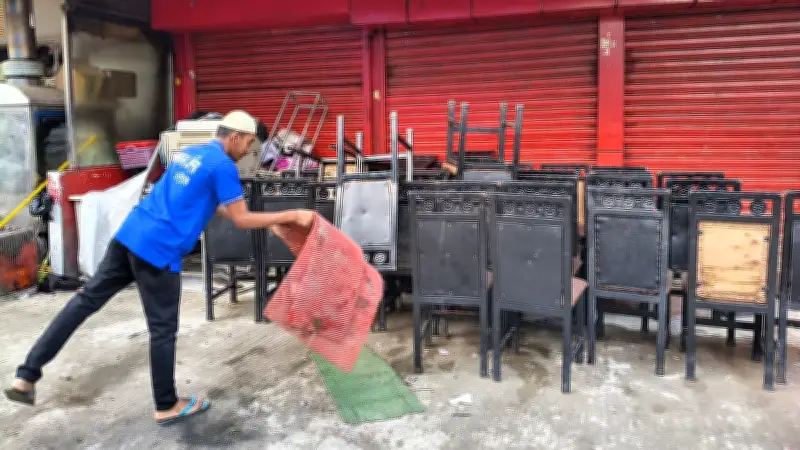 জলাবদ্ধতায় ক্ষতিগ্রস্ত কিচেন এশিয়া রেস্তোরাঁর আসবাবসহ জিনিসপত্র শুকাতে দিচ্ছেন এক কর্মী। আজ বিকেলে চট্টগ্রাম নগরের প্রবর্তক মোড়ে এই দৃশ্য দেখা গেছে। ব্যবস্থাপক শাহেদ আলম জানান, চেয়ার-টেবিল সরাতে সরাতেই দোকানের রান্নাঘরে পানি ঢুকে পড়ে। ১৫-২০ মিনিটের মধ্যে সব ভেসে গেছে, রান্না করা খাবারও বাঁচাতে পারেননি।