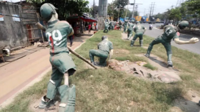 ছবির গল্পে দেখা গেছে, একটি ভাস্কর্যের হাত বিচ্ছিন্ন অবস্থায় পড়ে আছে। আরেকটি ভাস্কর্যের ব্যাটসম্যানের হাতে আর ব্যাট নেই। একটি ভাস্কর্যের গলায় রশি পেঁচিয়ে রাখা হয়েছে। ভাস্কর্যের সামনে ময়লা-আবর্জনা ফেলে রাখা হয়েছে। লাল-সবুজ জার্সি ধুলাবালুতে বিবর্ণ হয়ে গেছে। একটি ভাস্কর্যের এক পা ভেঙে গেছে, বাঁশ দিয়ে ঠেস দিয়ে রাখা হয়েছে। ব্যাটসম্যান ভাস্কর্যের ব্যাট ভেঙে নিয়ে গেছে।