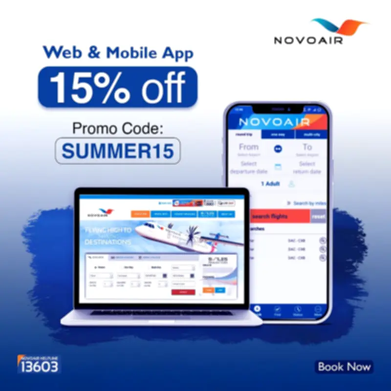নভোএয়ারের এক সংবাদ বিজ্ঞপ্তিতে জানানো হয়েছে, যাত্রীরা ‘SUMMER15’ প্রোমো কোড ব্যবহার করে সংস্থাটির ওয়েবসাইট বা মোবাইল অ্যাপের মাধ্যমে টিকিট কিনলে এই ১৫ শতাংশ ছাড় পাবেন। বর্তমানে নভোএয়ার প্রতিদিন ঢাকা থেকে কক্সবাজার, চট্টগ্রাম, সিলেট ও সৈয়দপুর রুটে ফ্লাইট পরিচালনা করছে। এই সব রুটেই ছাড়ের সুবিধা প্রযোজ্য হবে।