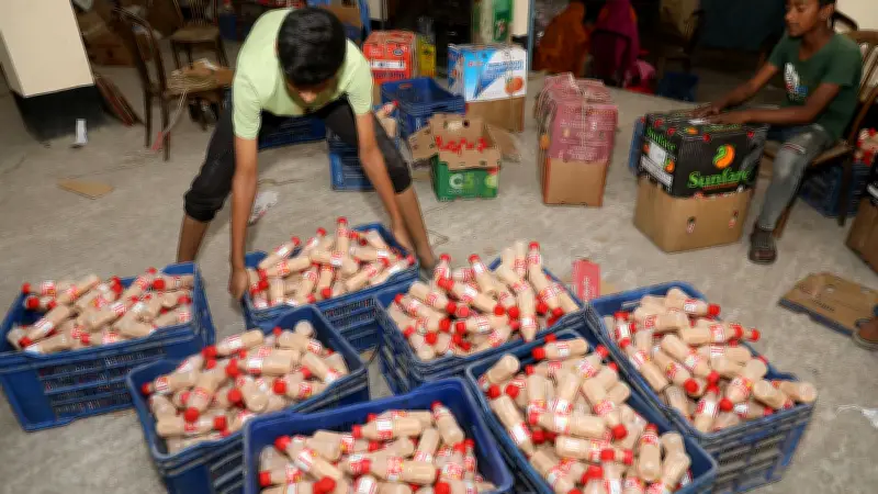 বিভিন্ন স্থানে পাঠানোর জন্য মাঠার বোতল কার্টনে ভরছেন শ্রমিকেরা। এই ধাপে মাঠাগুলোকে সুরক্ষিতভাবে প্যাকেজিং করে পরিবহনের জন্য প্রস্তুত করা হয়। শ্রমিকদের কঠোর পরিশ্রম এখানে স্পষ্টভাবে দৃশ্যমান।