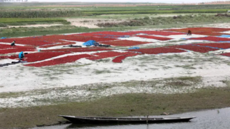 টিনের চালার নিচে বা উঠানে মরিচ শুকানো হচ্ছে। এক নারী শুকাতে দেওয়া মরিচ নেড়েচেড়ে দিচ্ছেন। বাঁশের তৈরি কারুল দিয়ে মরিচ নেড়ে দেওয়া হচ্ছে। বালুর চরেও মরিচ শুকানো হচ্ছে।