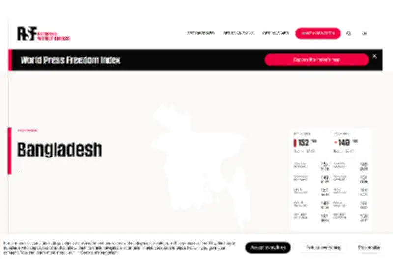 আরএসএফ প্রতিবছর বিশ্বের ১৮০টি দেশের সাংবাদিকতা ও সংবাদমাধ্যমের স্বাধীনতার চিত্র নিয়ে একটি সূচক প্রকাশ করে। এতে সংশ্লিষ্ট দেশগুলোর গণমাধ্যমের স্বাধীনতা পরিস্থিতিকে ‘খুবই উদ্বেগজনক’ থেকে শুরু করে ‘ভালো’—এই পাঁচটি স্তরে মূল্যায়ন করা হয়। আরএসএফের প্রতিবেদন অনুযায়ী, ২০২৬ সালের বিশ্ব গণমাধ্যমের স্বাধীনতা সূচকে বাংলাদেশের অবস্থান ১৫২তম। গত বছর (২০২৫) অবস্থান ছিল ১৪৯তম। অর্থাৎ এক বছরে সূচকে আরও তিন ধাপ অবনতি হয়েছে।