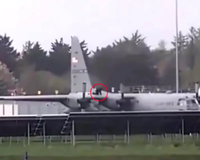 সামাজিক যোগাযোগমাধ্যমে ছড়িয়ে পড়া একটি ভিডিও ফুটেজে দেখা গেছে, এক ব্যক্তি বিমানবন্দরের ট্যাক্সিওয়েতে দাঁড়িয়ে থাকা মার্কিন বিমানবাহিনীর ‘সি-১৩০ হারকিউলিস’ মডেলের একটি পরিবহন উড়োজাহাজের ডানার ওপর স্পষ্টতই চড়ে বসেছেন। ভিডিওটি দ্রুত ভাইরাল হয়ে ওঠে এবং স্থানীয় কর্তৃপক্ষের দৃষ্টি আকর্ষণ করে।
